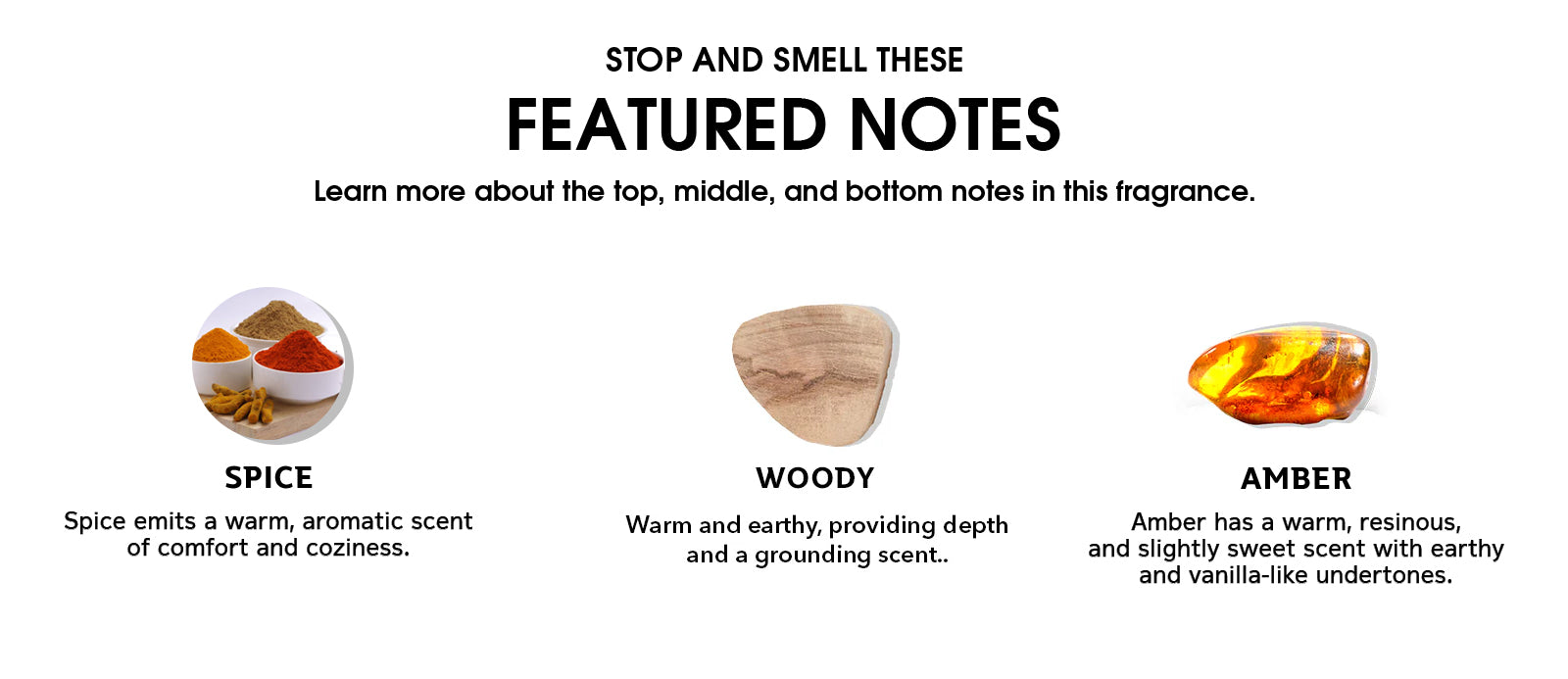 It opens with warm spicy and sweet top notes, followed by a heart of woody and vanilla. The scent finally settles into a rich base of amber and citrus, leaving a lasting impression.