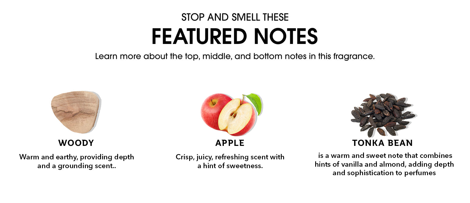 Top notes are Green Mandarin and Apple; middle notes are Nutmeg, Orange Blossom and Carrot Seeds; base notes are Vanilla, Tonka Bean, Suede and Woody Notes.