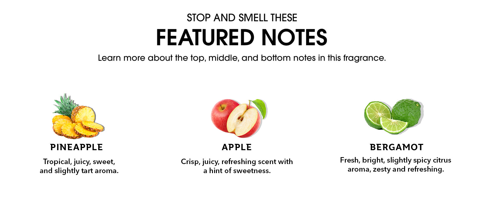 Top notes are Bergamot, Black Currant, Apple, Lemon and Pink Pepper. The Middle notes include Pineapple, Patchouli and Moroccan Jasmine. The base notes are Birch, Musk, oak moss, Ambroxan and Cedarwood.