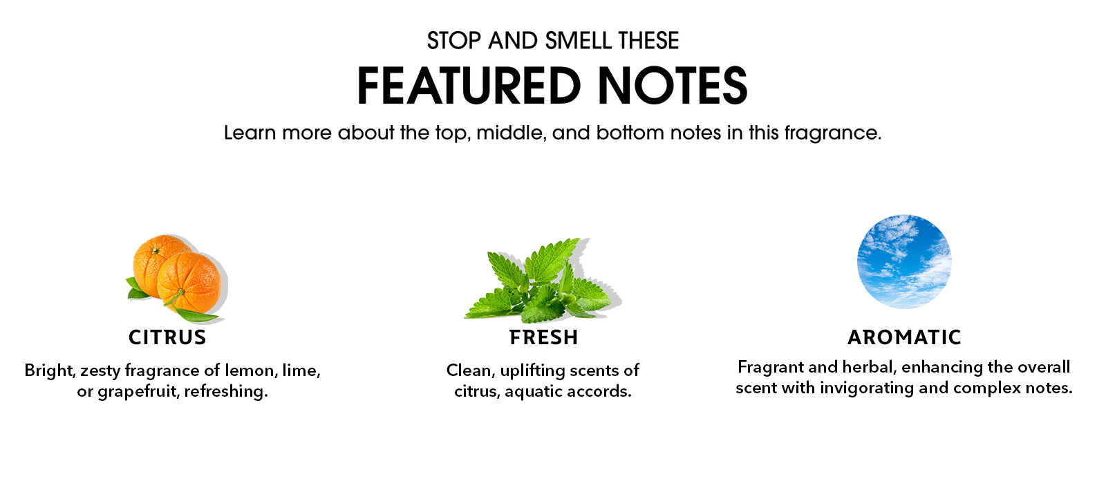 Aqua Alert opens with lime, lemon, bergamot, and jasmine, followed by sea notes, peach, and freesia in the heart. It finishes with a base of white musk, cedar, and amber.