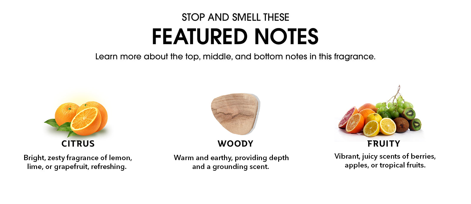 The top notes of this perfume are Mandarin Orange and Bergamot, while the middle notes are Black Currant and Green Tea. The base notes include Musk, Sandalwood, Petitgrain and Galbanum.