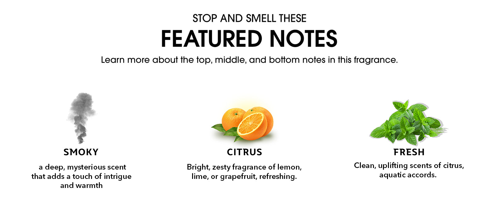 Top notes are Grapefruit, Lemon, Mint, Pink Pepper, Bergamot, Aldehydes and Coriander; middle notes are Ginger, Nutmeg, Jasmine and Melon; base notes are Incense, Amber, Cedar, Sandalwood, Patchouli, Amberwood and Labdanum.